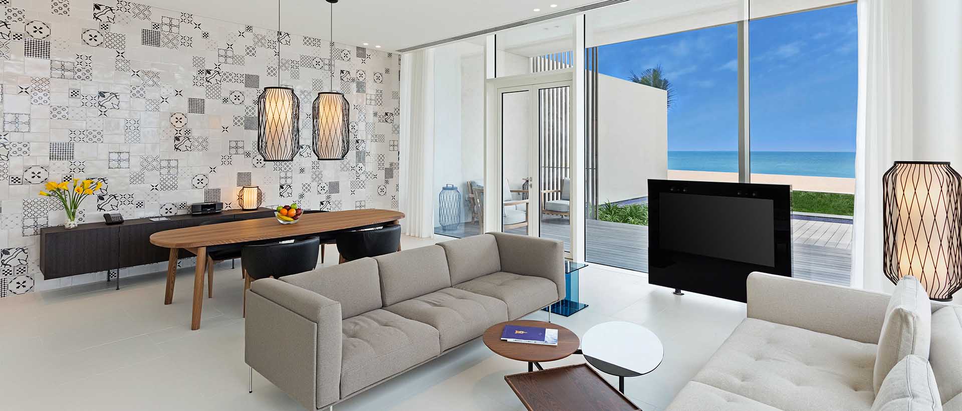 Гостиная, 2 спальни, есть межкомнатные двери, вид на Персидский залив, ванная, гостевой туалет, собственный бассейн, терраса с шезлонгами, дворецкий, кровати king-size и twin beds.